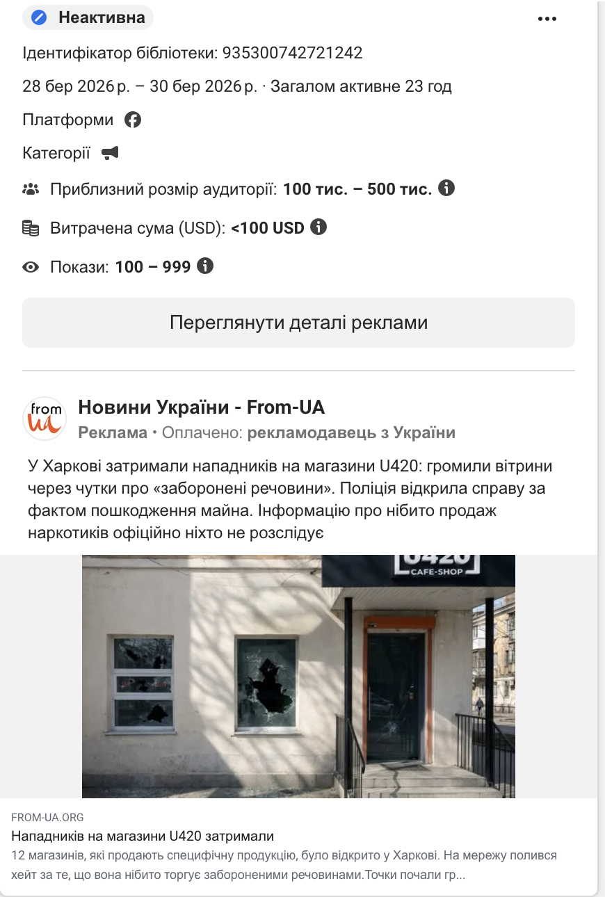 Сторінка «Новини України - From-UA» розмістила оплачену рекламу (ID: 935300742721242) у Facebook з 28 по 30 березня 2026 (23 години, <100 USD, аудиторія 100-500 тис.). Текст: «Інформацію про нібито продаж наркотиків офіційно ніхто не розслідує». Реклама фреймить лабораторно доведений факт продажу заборонених речовин як «чутки», а погроми магазинів — як головну проблему. From-UA — ресурс, відомий розміщенням замовних матеріалів. Хтось заплатив за цей наратив через 3 дні після розслідування Bihus.Info.