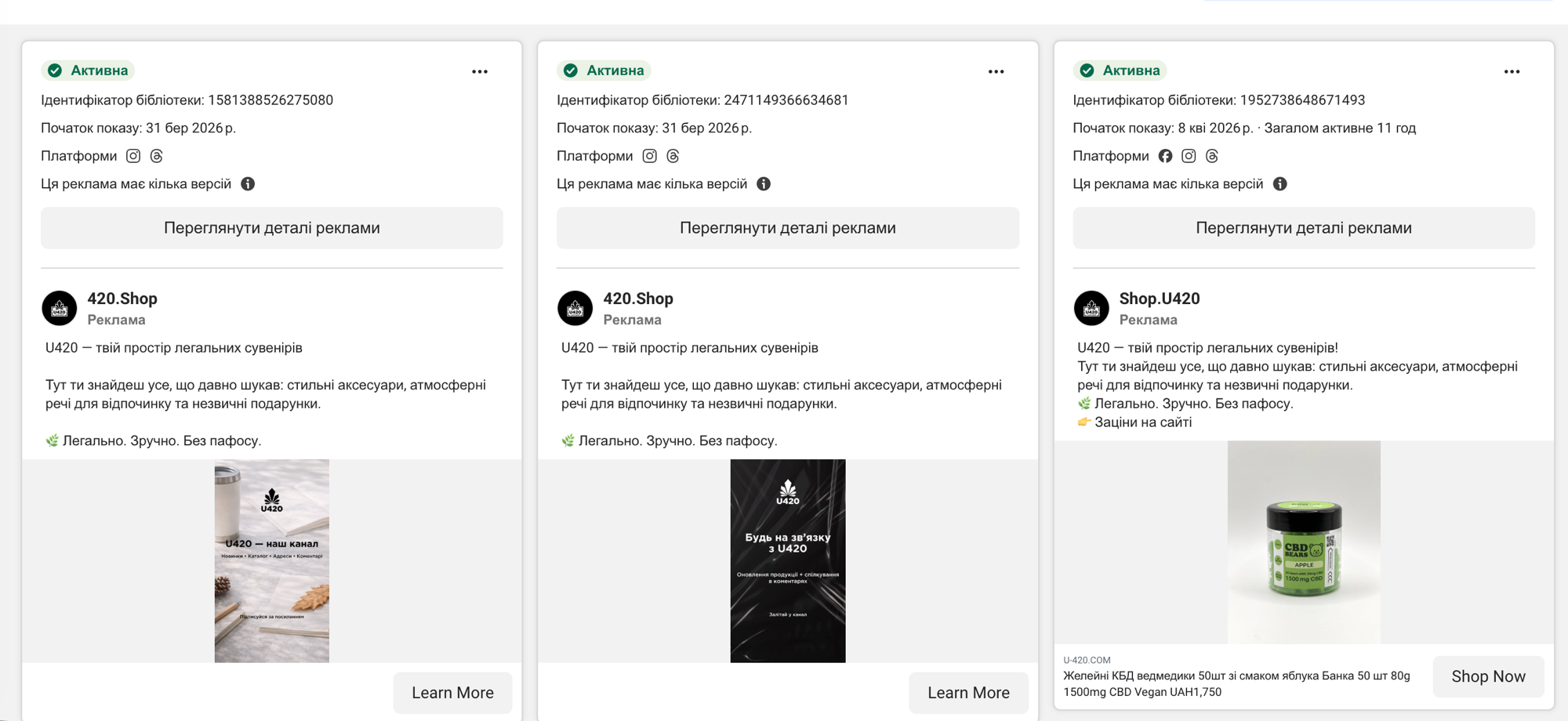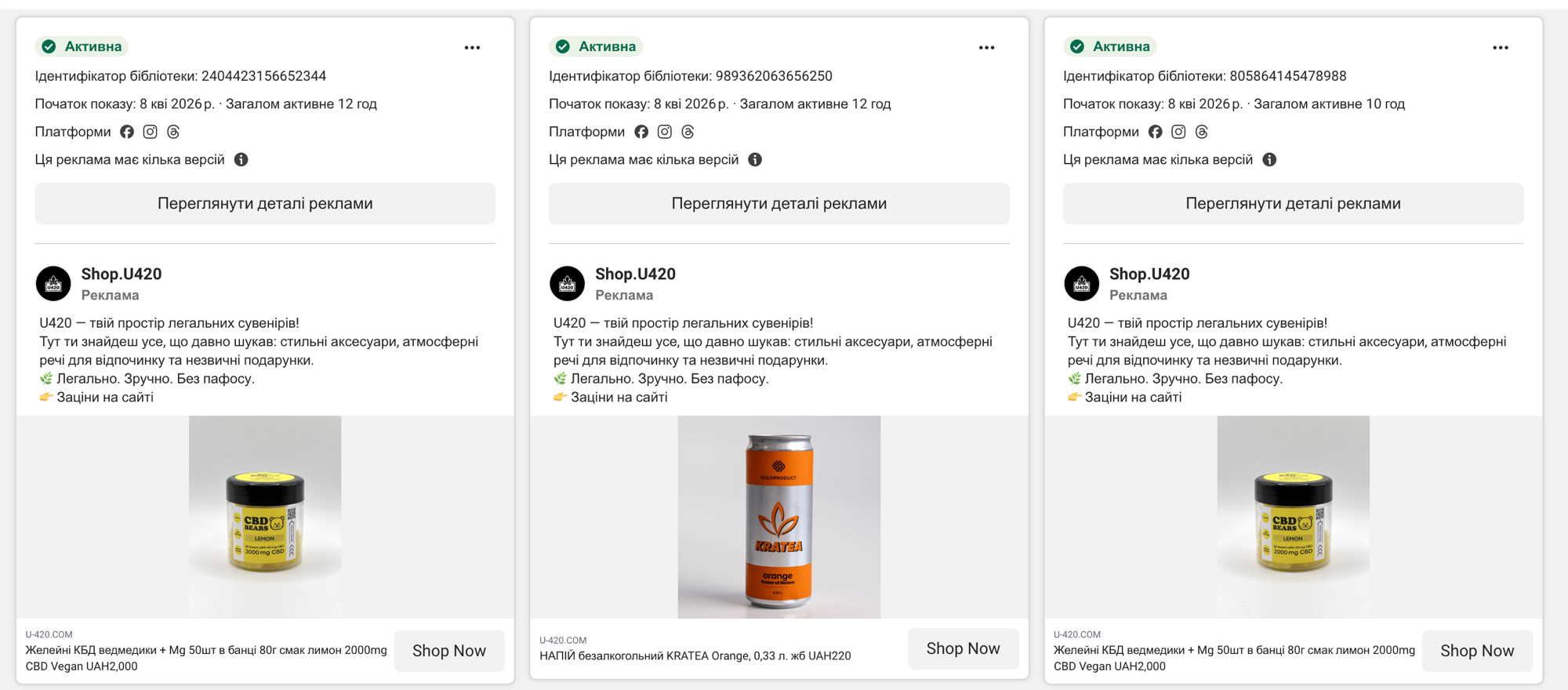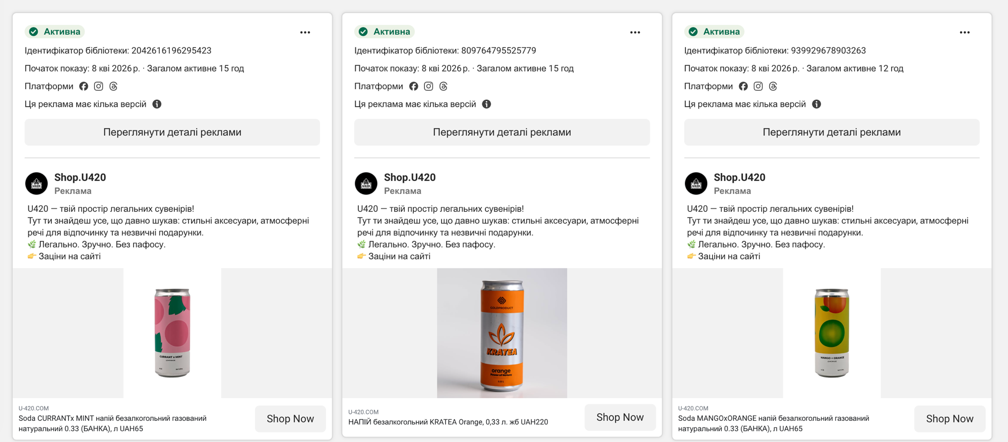 Станом на 8 квітня 2026 мережа U420 має близько 49 активних рекламних оголошень у Meta Ad Library через два акаунти: «420.Shop» (з 31 березня) та «Shop.U420» (з 8 квітня). Реклама крутиться на Facebook, Instagram та Threads. Продукція: CBD-желейки (UAH 1750-2000), напої KRATEA (UAH 220), соди (UAH 65). Всі оголошення ведуть на новий домен u-420.com. ID оголошень: 1581388526275080, 2471149366634681, 1952738648671493, 2404423156652344, 989362063656250, 805864145478988, 2042616196295423, 809764795525779, 939929678903263. Реклама працює ПІСЛЯ розслідування Bihus.Info та скандалу з рекламою в Київському метро.