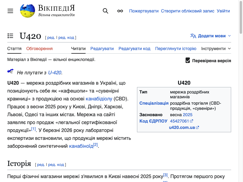Слідство.Інфо опублікувало розслідування: номінальний ФОП мережі U420 Володимир Чебан через адвокатку Олесю Серебряник подав позов до адміністративного суду (справа №П/320/11570/26) з вимогою скасувати Постанову КМУ №146 від 05.02.2026, якою ADB-4en-PINACA внесено до переліку заборонених речовин. Адвокатка заявила, що заборона «фактично унеможливлює продовження господарської діяльності» та спричиняє «значні фінансові втрати». Чебан — неодноразово судимий (наркотики 2007, крадіжка+зброя 2009, крадіжки 2015/2019, колонія Кривий Ріг 2018-2022, метадон у Києві січень 2026). ФОП Чебана вказувався на сайті u420.com.ua. Три клопотання про зупинення постанови відхилені. Серебряник заявила, що представляє «не лише Чебана», а й інших осіб з мережі U420. Zaxid.net також опублікував матеріал — зафіксовано щонайменше 8 точок U420 у Львові.